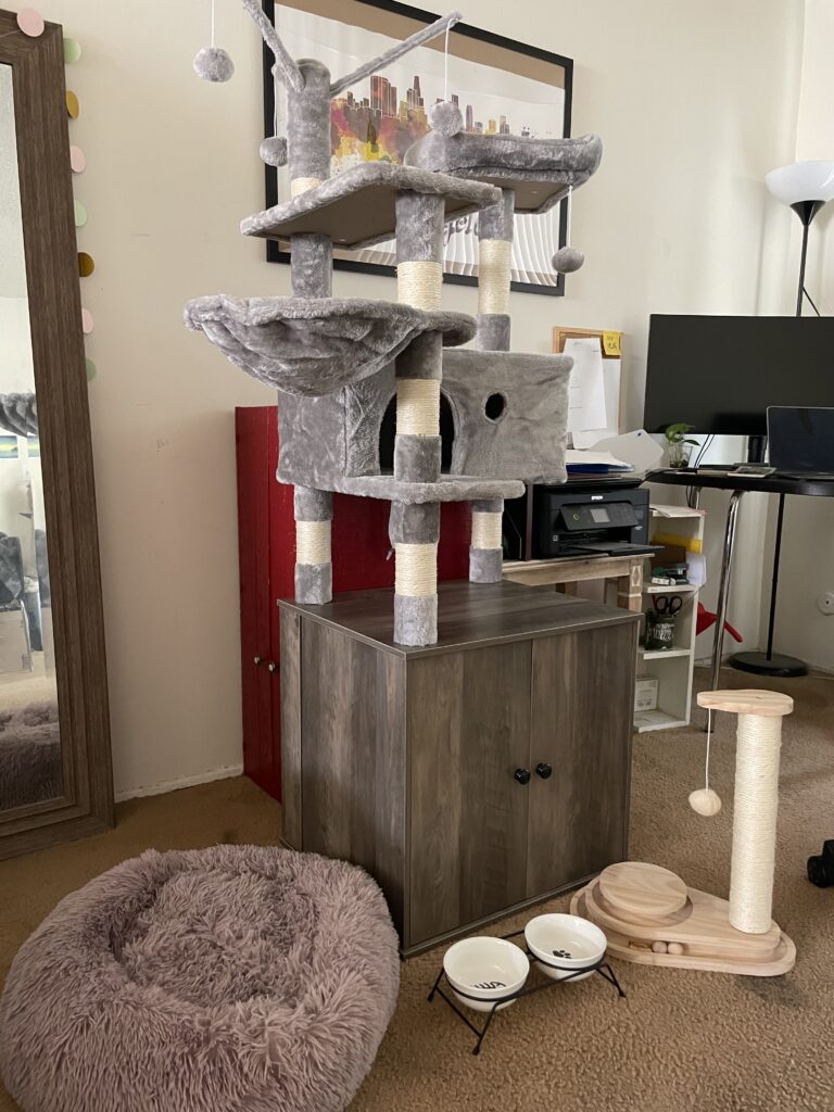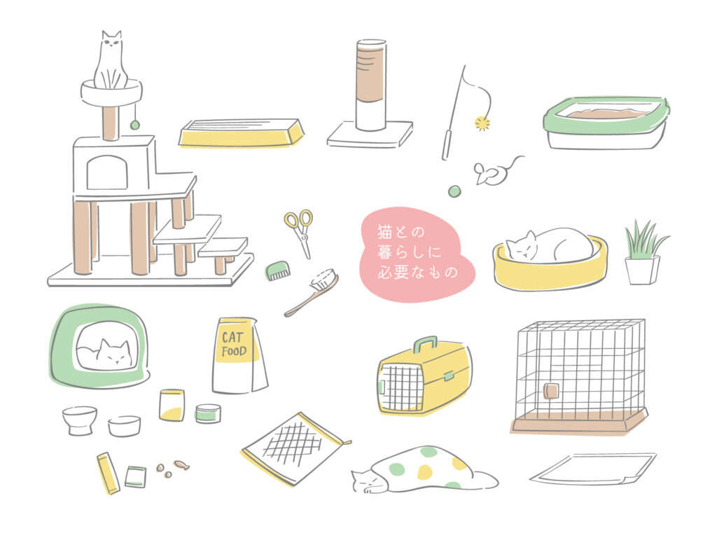 キャットタワーやトイレ、おもちゃやご飯皿など。